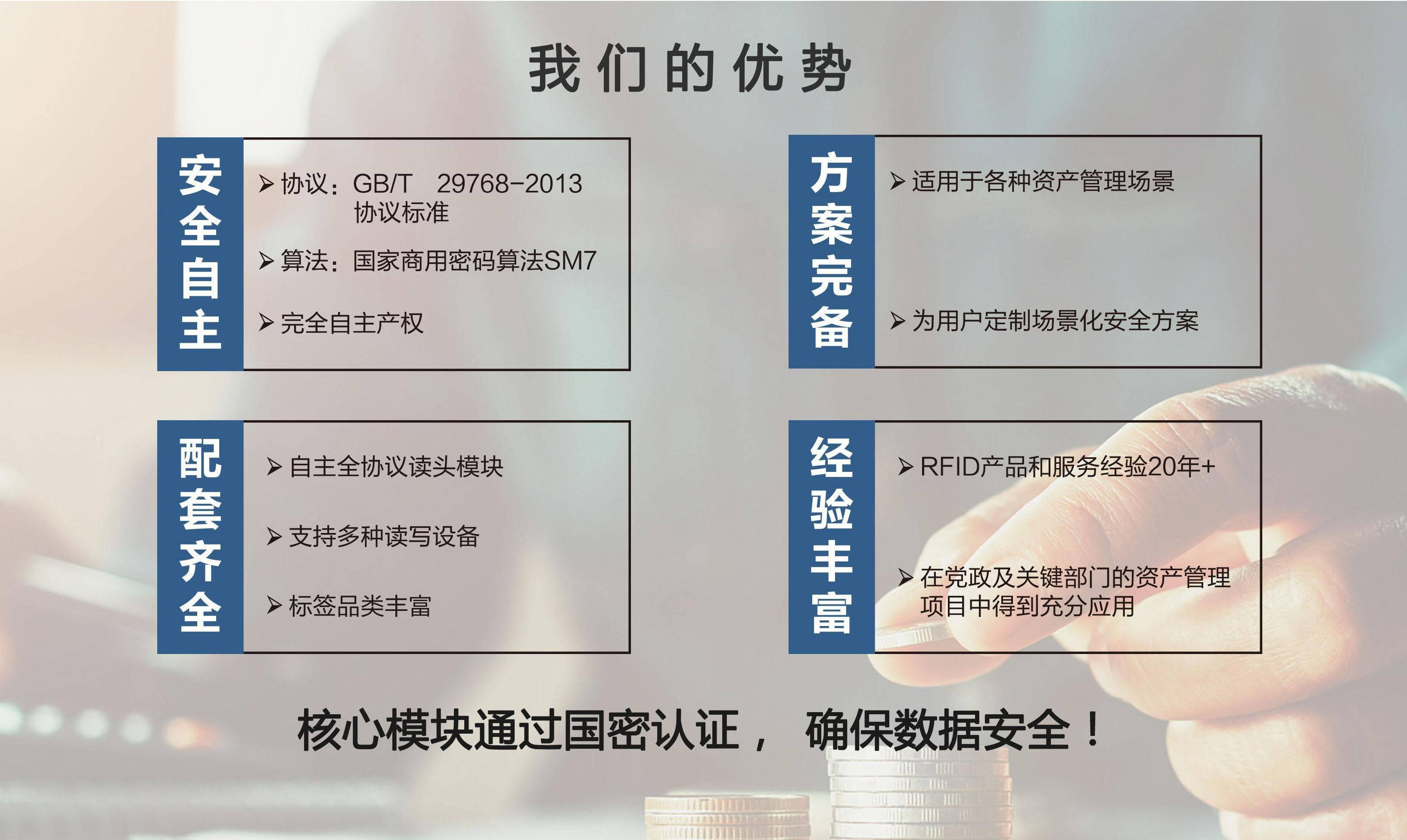 復旦微電子推出“超高頻國標+國密的RFID方案”,通過人防和技防同步推進,對重要物資和涉密資產進行有效監管,防止重要資產流失及重要信息泄密,實現對用戶資產的全生命周期信息化管理。此安全資產管理可實現:統一管理授權;涉密與非涉密分級;安全通道監管;維保通勤管理;統一資產盤點;外來資產登記;資產車輛管理;重要資產管理等。