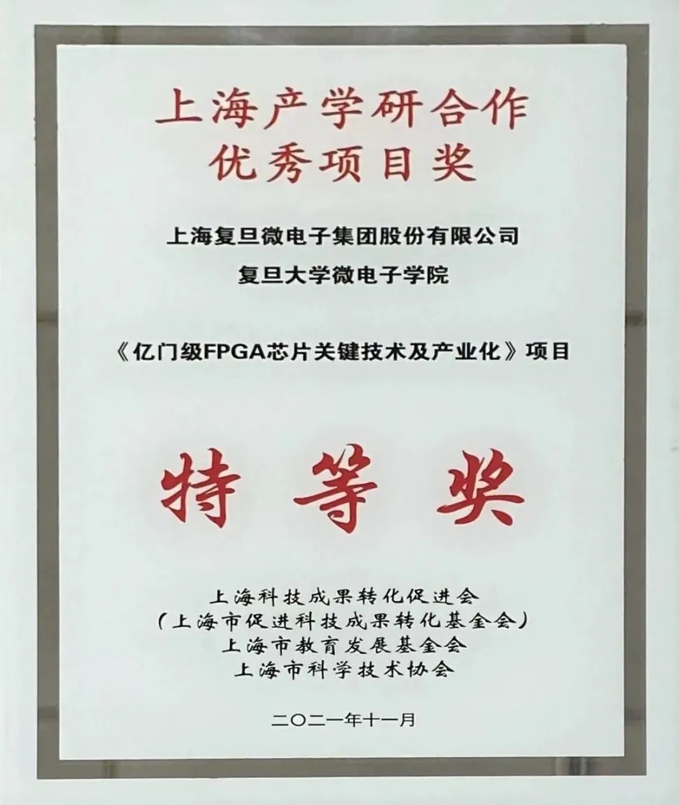 經過前期的推薦申報、專家評審和社會公示,經上海科技成果轉化促進會、上海市教育發展基金會、上海市科學技術協會審定批準,授予上海復旦微電子集團股份有限公司、復旦大學微電子學院的合作項目《億門級FPGA芯片關鍵技術及產業化》2021年上海產學研合作優秀項目獎特等獎。